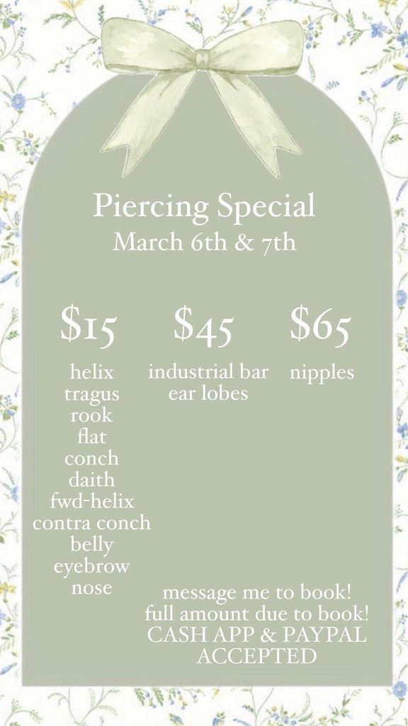 ⭐️i will be posting a special later on today! ALL PIERCING SPECIALS ARE PRE PAY ONLY and i only accept CASH APP & PAYPAL!